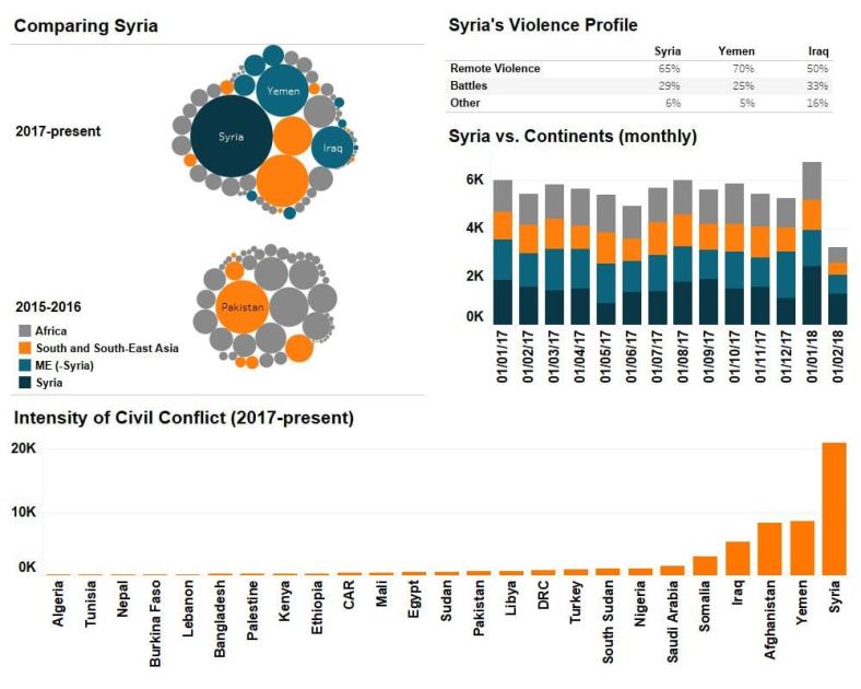 Syria is very bad compared to other spaces. Syria averages 70 violent reported events per day, and is currently as violent as all African conflicts plus South Asian fragile countries combined (see visual). To comprehend this number, take a combination of Kenya and Burundi’s lingering unrest, with the Congo’s emerging war, the continuing crises in CAR, Somalia, both Sudan’s, conflict in Nigeria, AQIMS increasing presence in West-Africa and Libya’s continuing problems, and still you do not equal the number of clashes and attacks in Syria’s conflict. Or consider that the number of events during one week of the Afrin offensive (the week of February 5, 2018) is similar in intensity to all violence in the Middle East (with active conflicts like Afghanistan, Yemen and Iraq) plus all protests/incidents in South-East Asia.