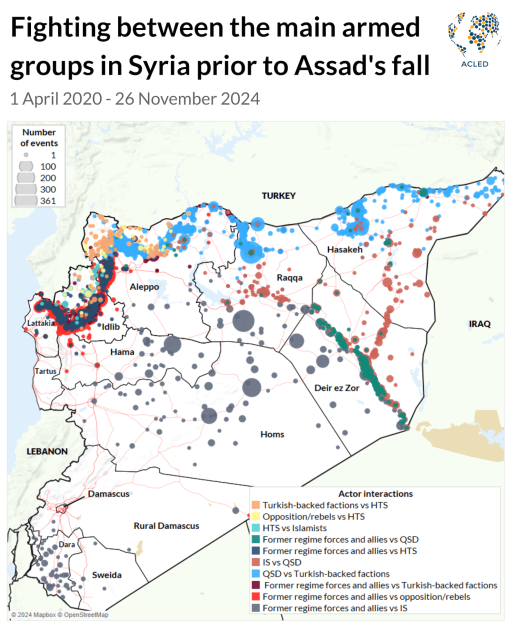 Despite the recent coordination between opposition groups in the Military Operations Command (MOC) coalition led by Hayat Tahrir al-Sham (HTS), the future shape of Syria remains uncertain due to historical hostilities and ongoing divisions among the different armed groups throughout the country. ACLED data highlights previous confrontations between these groups since April 2020, when the territorial control of the country was frozen (see maps below). Although Islamic State fighters no longer control territory in Syria, their interactions with key actors — including the Syrian Democratic Forces (SDF) — remain an important dimension of the conflict.