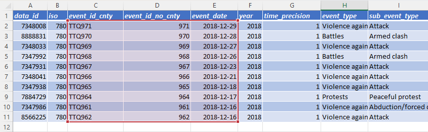 ACLED originally created the event_id_no_cnty column so users could sort event IDs within a single country. However, other columns (e.g. event_date or timestamp) can be used to sort events chronologically and do so more accurately. Because of its redundancy and potential inaccuracy when used for chronological sorting, the event_id_no_cnty column was removed from the ACLED dataset. If a user still requires this column, it can easily be reproduced using the event_id_cnty column (see below for details).