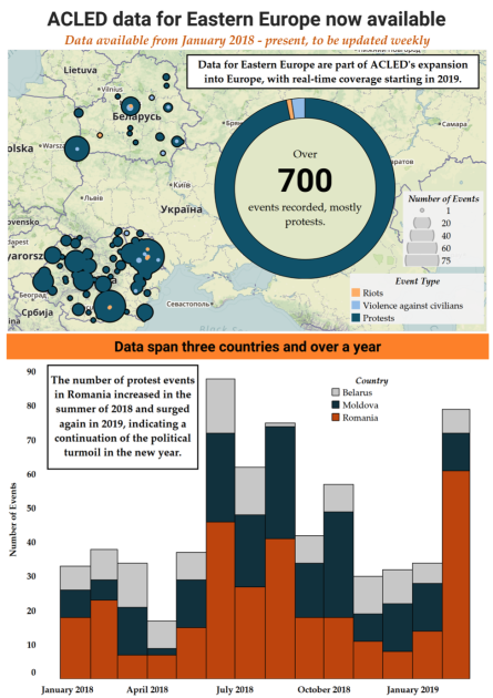 Over 700 political violence and protest events have been recorded in Romania, Moldova, and Belarus from 2018.