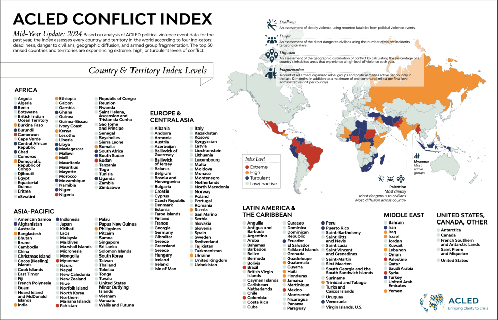 ACLED’s Conflict Index ranks every country and territory in the world by four measures: diffusion, deadliness, danger to civilians, and fragmentation. Palestine ranks at the top for three out of the four indicators — diffusion, deadliness, and danger to civilians — with Myanmar’s more than 1,500 armed groups giving it the top spot as the most fragmented country; a stark change from the findings of the January 2024 edition.