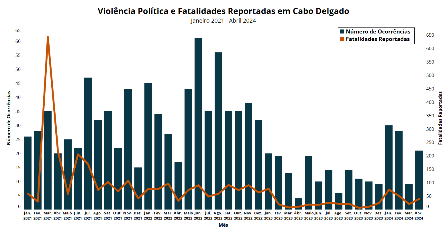 - ACLED regista 26 eventos de violência política relacionados com a insurgência nas províncias de Cabo Delgado e Nampula em Abril, resultando em pelo menos 44 fatalidades.
