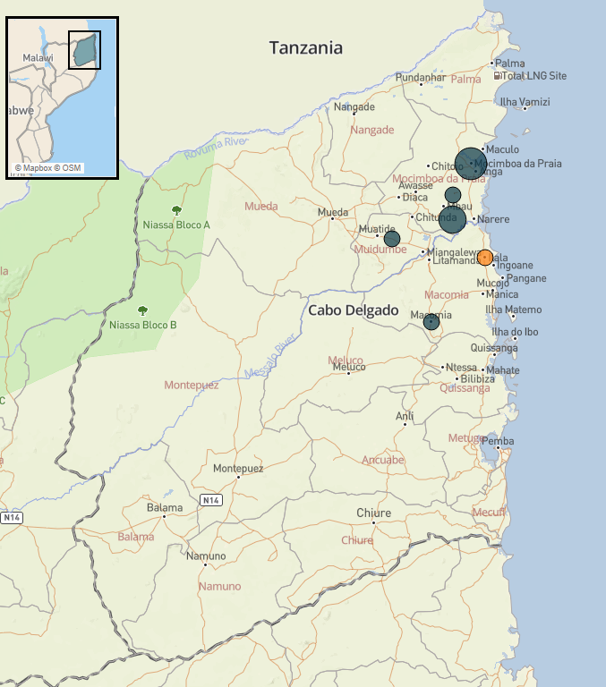 - Os eventos de violência política concentraram-se em Macomia e Mocímboa da Praia. Três incidentes envolvendo civis envolvendo forças do Estado foram registrados no distrito de Mocímboa da Praia, resultando em duas fatalidades relatadas
