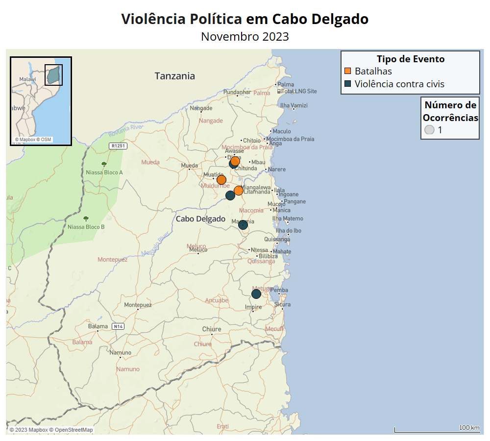 A violência política em Novembro voltou a concentrar-se nos distritos de Macomia, Mocímboa da Praia e Muidumbe, com um incidente isolado no distrito de Metuge. Os três eventos mais significativos ocorreram ao longo de doze dias, com uma série de ataques perpetrados pelo Estado Islâmico de Moçambique (EIM) num triângulo de território que abrange o rio Messalo, nos distritos de Macomia, Mocímboa da Praia e Muidumbe.