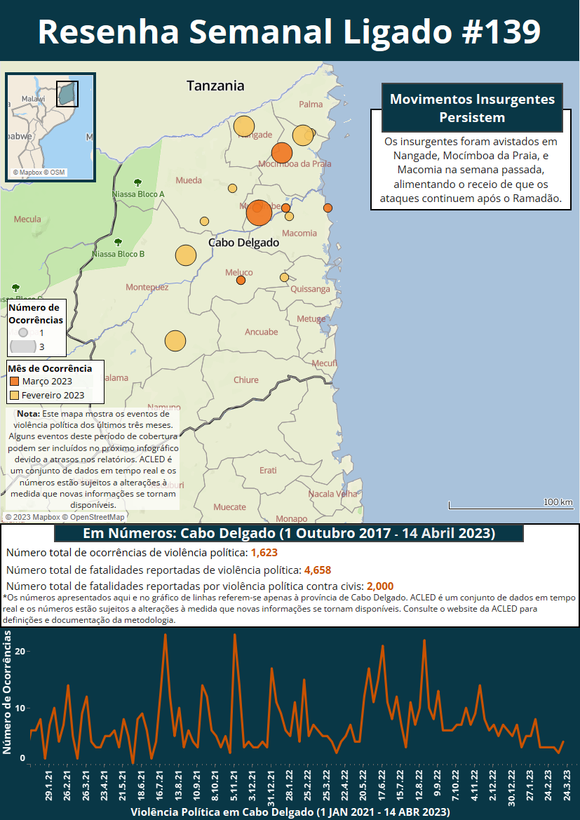 Relatório Cabo Ligado Semanal cobrindo os eventos e insights de 10 a 16 de abril de 2023 em Cabo Delgado.