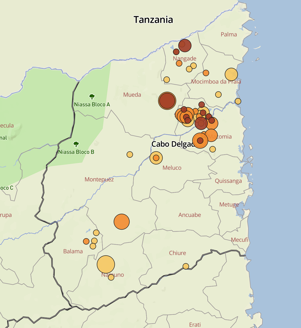 O padrão de incidentes na semana passada sugere que alguns grupos insurgentes podem estar a dispersar-se por Cabo Delgado a partir dos distritos de Macomia e Muidumbe, onde a maioria dos confrontos e ataques se concentraram até então no presente ano.