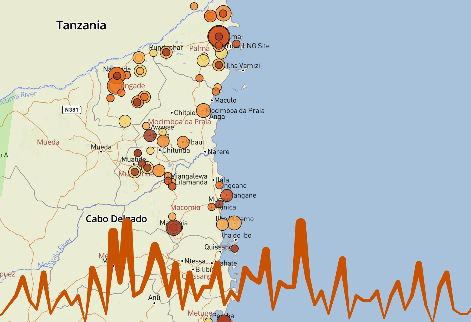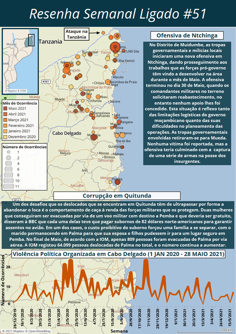 Novas informações sobre incidentes anteriores também vieram à tona na semana passada. No dia 22 de Maio, houve confrontos entre as forças governamentais e os insurgentes na zona baixa de Palma, a área da vila mais próxima do principal local que abriga os deslocados em Quitunda. As estimativas de baixas variam, mas as estimativas mais prudentes sugerem que quatro civis e cinco insurgentes foram mortos. Os insurgentes também incendiaram 14 casas e uma mesquita na parte baixa de Palma. Quando confrontados pelas Forças de Defesa e Segurança, os insurgentes retiraram-se para o norte ao longo da estrada que leva a Quiwiya e, eventualmente, à Tanzânia.