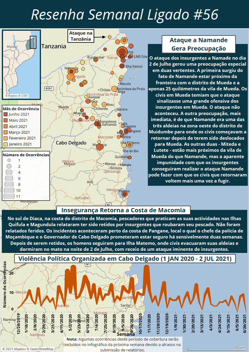Na última sexta-feira, houve registo de incidentes de violência em três partes da zona de conflito em Cabo Delgado, com os insurgentes protagonizando ataques de pequena escala. No distrito de Muidumbe, um grupo de cerca de 10 insurgentes atacou a aldeia de Namande, no início da tarde de 2 de Julho. Eles chegaram trajados de uniformes da força de segurança moçambicana, mas rapidamente abriram fogo contra civis e milícias locais. Findo o ataque e a posterior retirada dos insurgentes, contabilizaram-se sete civis e três milicianos mortos. Durante o ataque, os insurgentes também incendiaram várias casas.