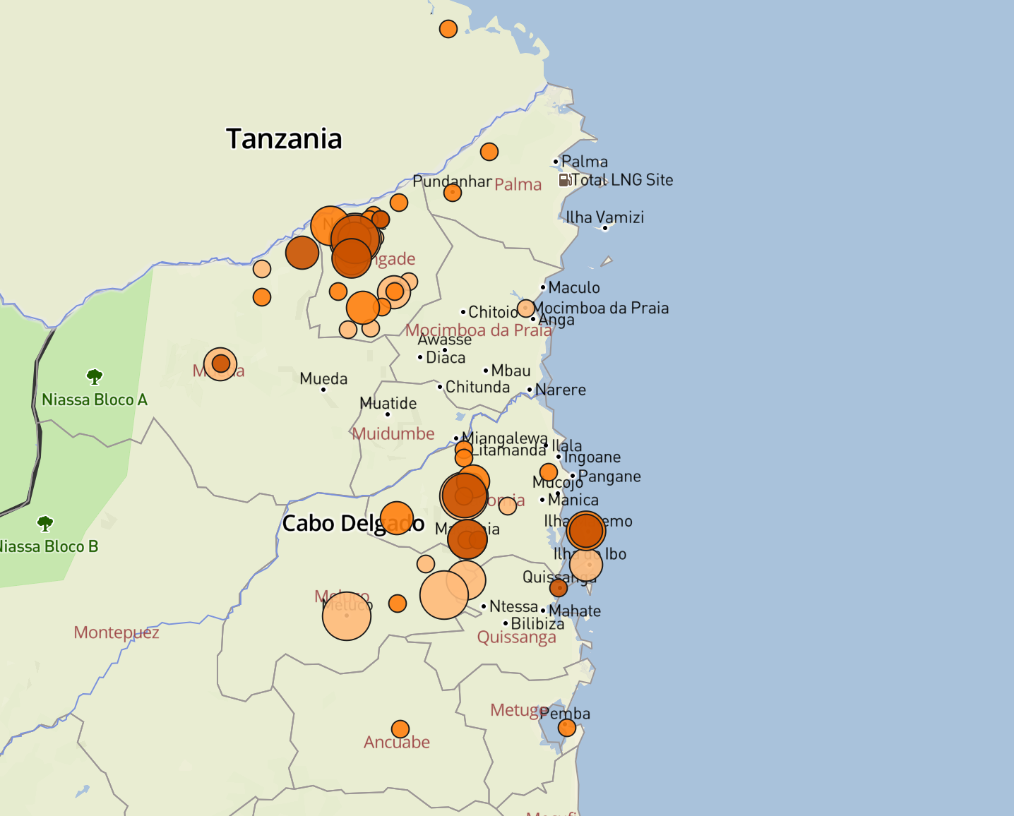 Embora no passado tenha havido lacunas consideráveis entre os ataques, este ano são aparentemente contínuos. Isto reflete-se nos dados da ACLED, que registraram 39 eventos de violência política organizada no distrito de Nangade durante o primeiro trimestre de 2022. Isto se compara a 14 eventos deste tipo envolvendo milícias islâmicas no último trimestre de 2021. Embora se possa esperar um pico de deslocamento, estimar números em áreas de difícil acesso é um desafio e pode levar a alguma variação. O ACNUR estimou que um total de 24.000 pessoas foram deslocadas dentro de Nangade de Janeiro a meados de Março, e aproximadamente 5.000 se mudaram para o distrito vizinho de Mueda. A OIM observa um aumento de quase 7.000 no número de deslocados internos no distrito entre as avaliações feitas em Novembro de 2021 e Fevereiro deste ano.