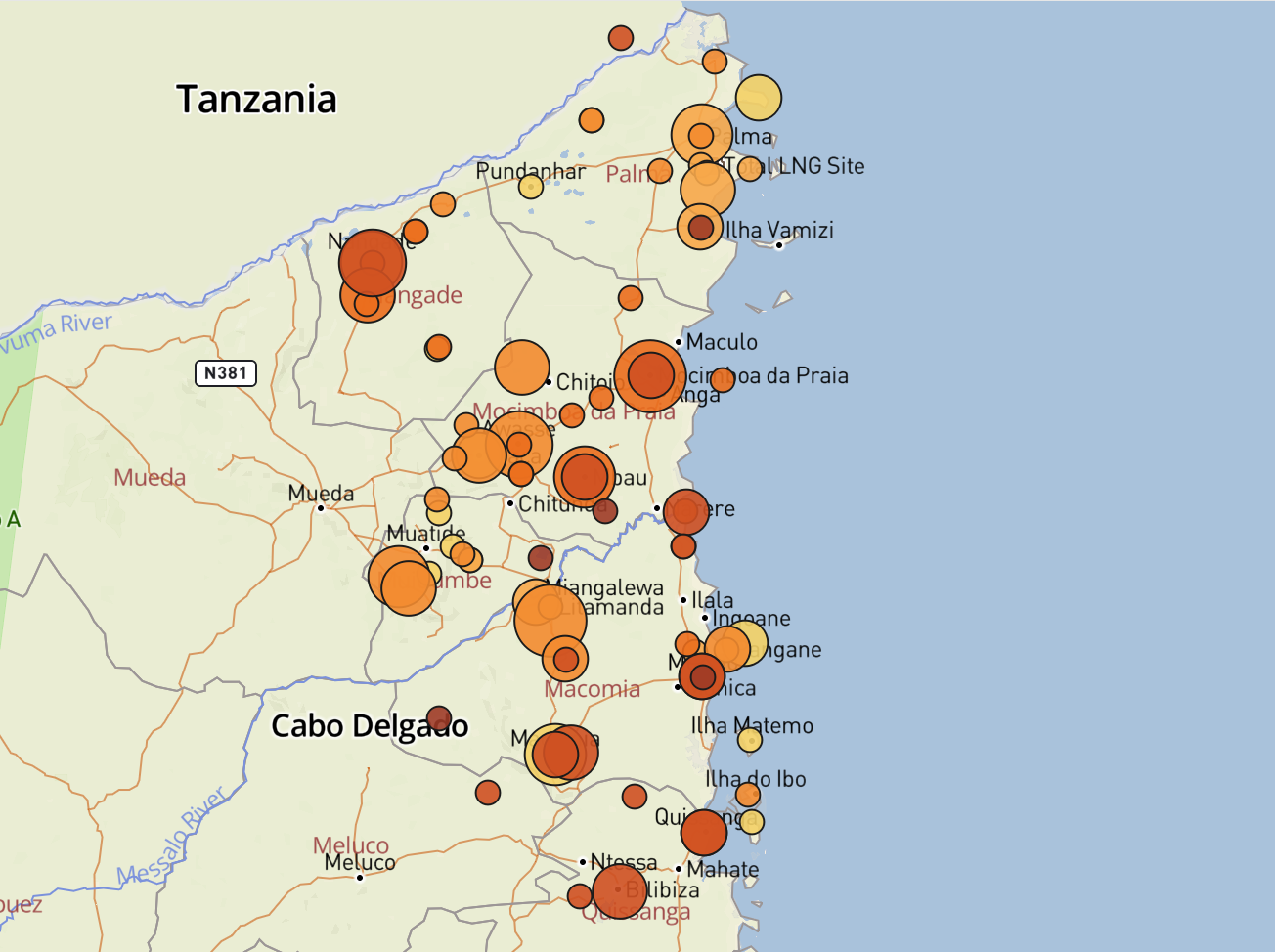 Resumo e análise da situação de crise e deslocamentos civis na região de Cabo Delgado, Moçambique.