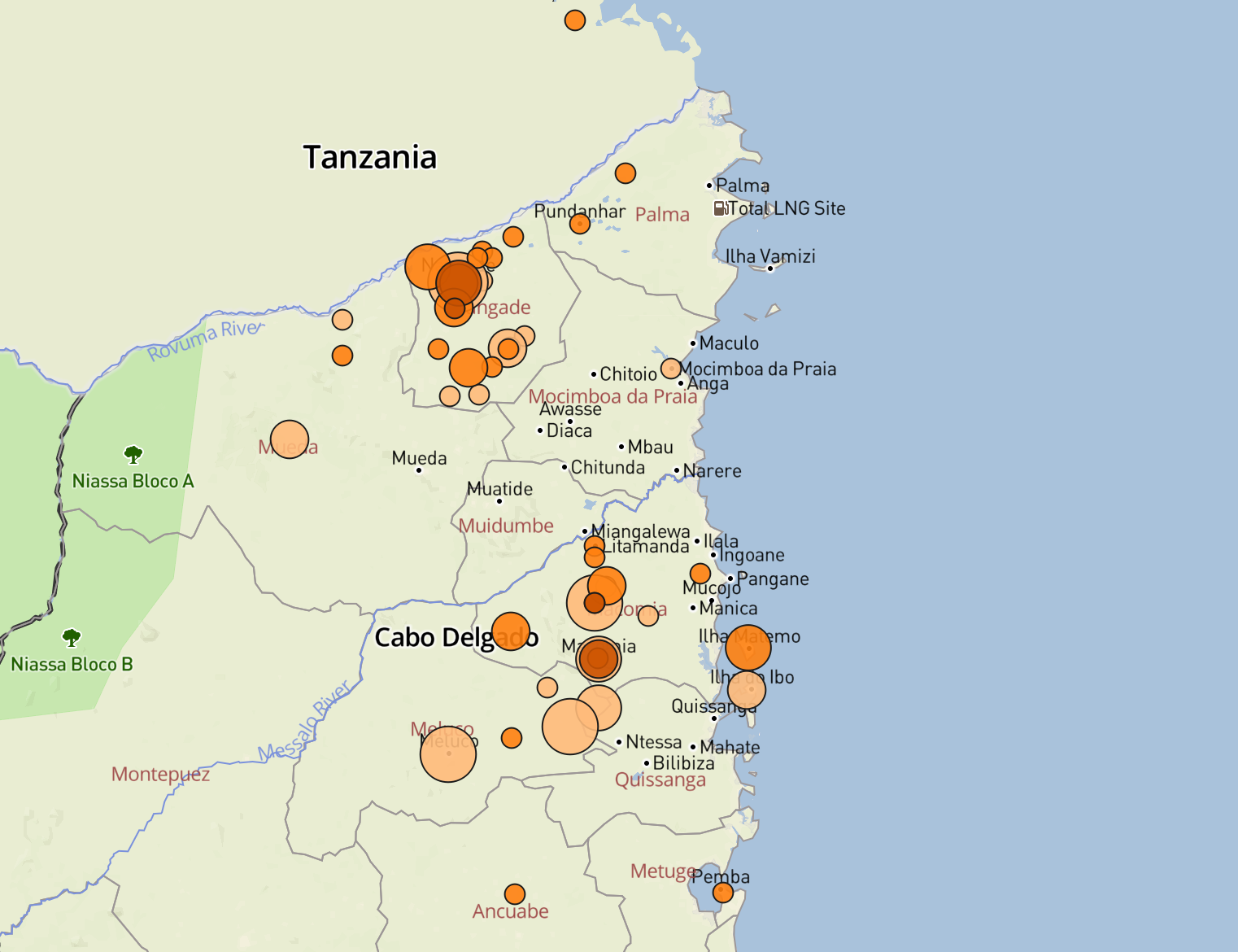 No dia 8 de Março, uma fonte em Nangade disse que apenas 13 dos 51 assentamentos no distrito não haviam sido atacados até agora: Nangade , Nang'omba, Tuliane, Ntoli, Itanda, Machokwe, Junho, Nanhagaia, Nhanga, Mualela, Chiduadua , Muade e Ntamba.