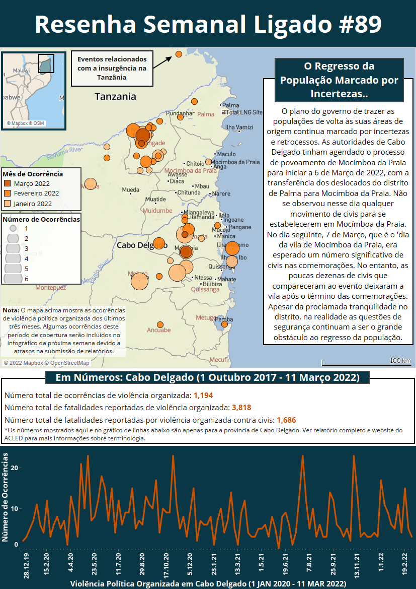 O plano do governo de trazer as populações de volta às suas áreas de origem continua marcado por incertezas e retrocessos. As autoridades de Cabo Delgado tinham agendado o processo de povoamento de Mocímboa da Praia para iniciar a 6 de Março de 2022, com a transferência dos deslocados do distrito de Palma para Mocímboa da Praia. Não se observou nesse dia qualquer movimento de civis para se estabelecerem em Mocímboa da Praia. No dia seguinte, 7 de Março, que é o 'dia da vila de Mocímboa da Praia, era esperado um número significativo de civis nas comemorações. No entanto, as poucas dezenas de civis que compareceram ao evento deixaram a vila após o término das comemorações. Apesar da proclamada tranquilidade no distrito, na realidade as questões de segurança continuam a ser o grande obstáculo ao regresso da população.