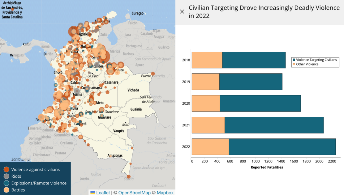 The security situation in Colombia continued to deteriorate in 2022, with worsening political violence and increasing violence against civilians. Despite recent attempts by the new leftist government of President Gustavo Petro to engage with armed groups, Colombia continues to struggle under the strain of a deeply fragmented conflict landscape that supports a myriad of armed groups, including Revolutionary Armed Forces of Colombia (FARC) dissident groups, the National Liberation Army (ELN), and the Gulf Clan.