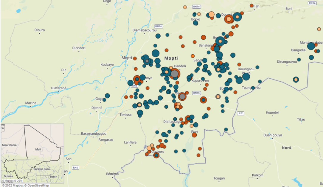 Dan Na Ambassagou is the main ethnic Dogon-majority militia and the umbrella organization of Dogon militias in ‘Dogon Country’. Over time, ACLED has coded events that may or may not be associated with the group Dan Na Ambassagou as Dogon Ethnic Militia (Mali) and Dozo Communal Militia (Mali). These coding designations are made based on reports that often do not mention the group’s name or use the collective terms ‘chasseurs’ or ‘Dozos’ (hunters). The lack of detailed reports also creates confusion about the various groups and their affiliation or non-affiliation with Dan Na Ambassagou. Therefore, the data in this report is based on what is collectively referred to as ‘Dan Na Ambassagou and similar groups.’