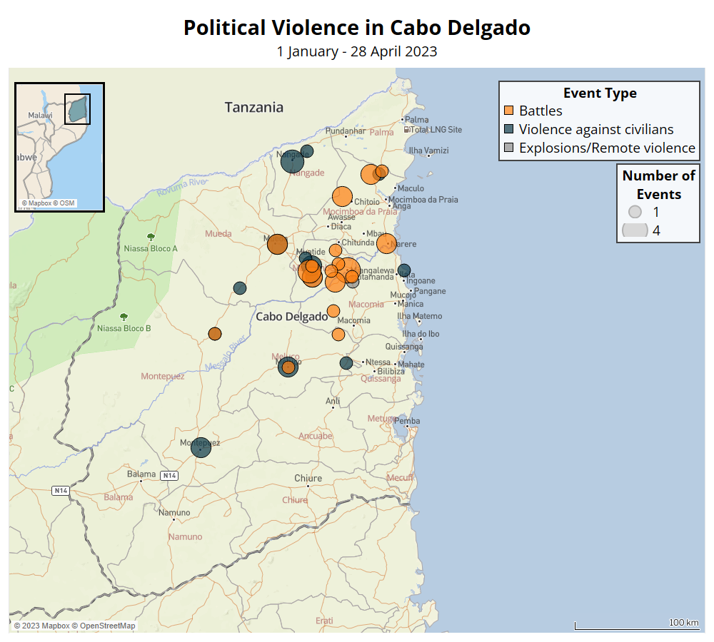 - ACLED records 53 political violence events in Cabo Delgado province from 1 January to 28 April 2023, resulting in 109 reported fatalities