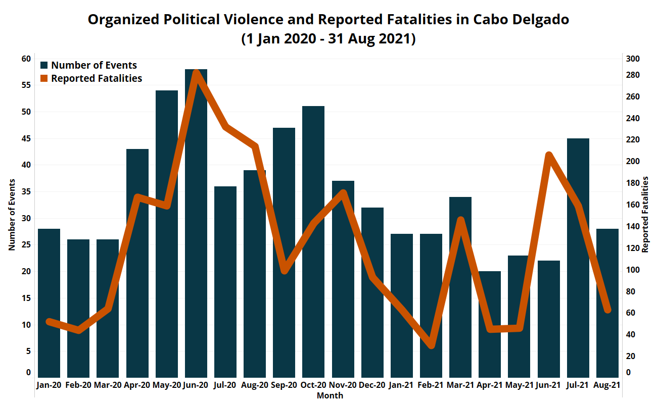 - ACLED records 28 organized political violence events in August, resulting in 63 reported fatalities. Both the events and fatality counts almost certainly understate the true level of combat in August, with Mozambican and allied troops operating in southern Mocimboa da Praia district with no media coverage for much of the month. Beyond clashes in Mocimboa da Praia district, other events took place in Macomia, Nangade, and Quissanga districts.