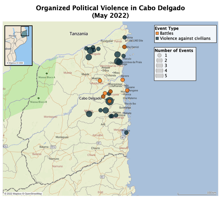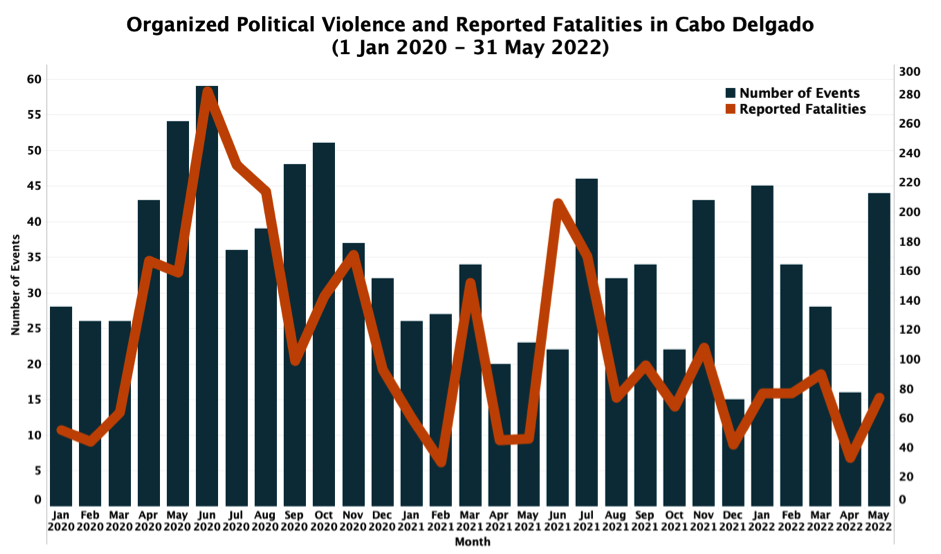 - ACLED recorded 44 organized political violence events in Cabo Delgado province in May, resulting in 74 reported fatalities