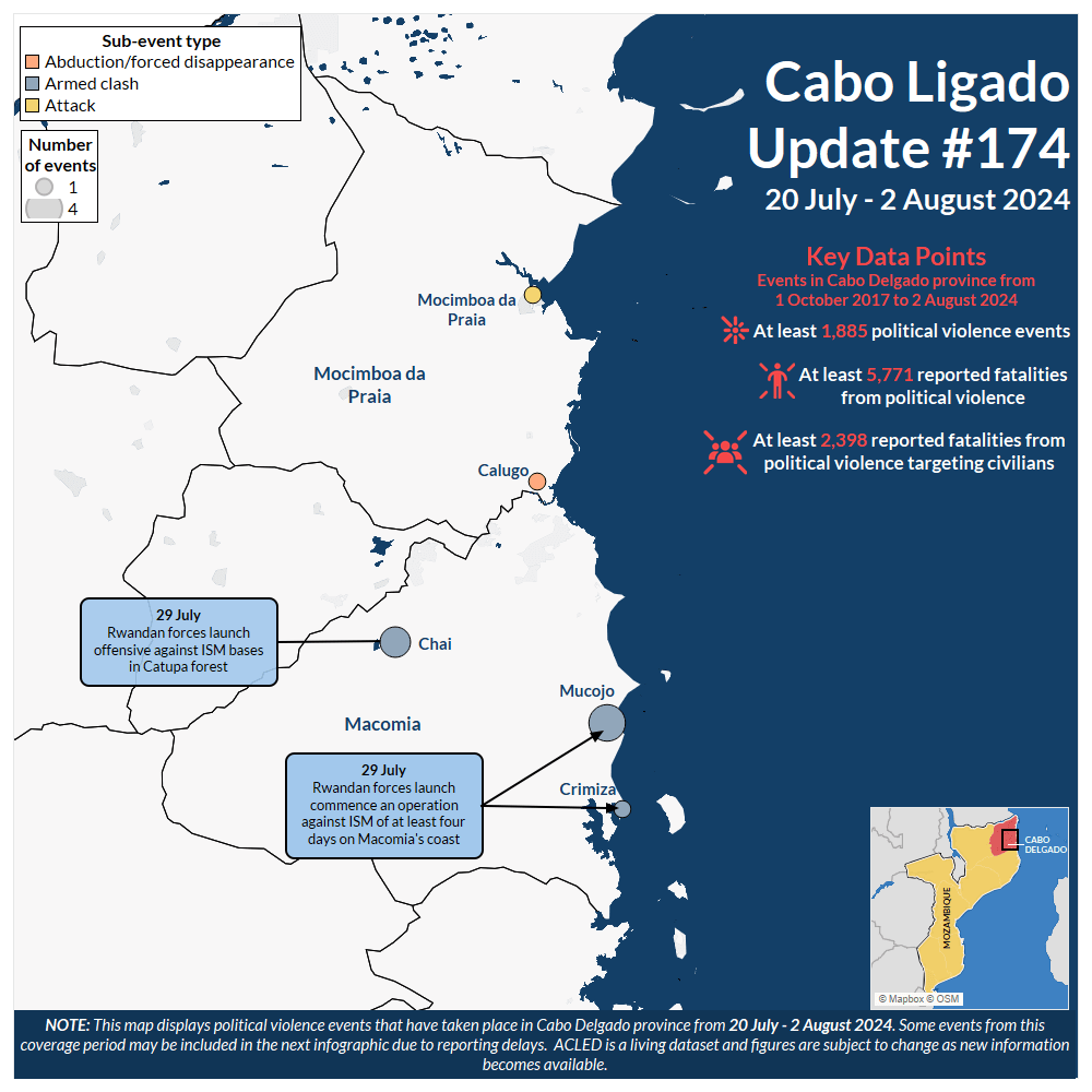 This offensive follows the deployment of several hundred Rwandan troops to Macomia town to replace the Southern African Development Community Mission in Mozambique, which officially withdrew on 15 July. The RSF arrived in Macomia town on 23 July and is expected to occupy bases along the N380 and near the border of Quissanga and Meluco districts.