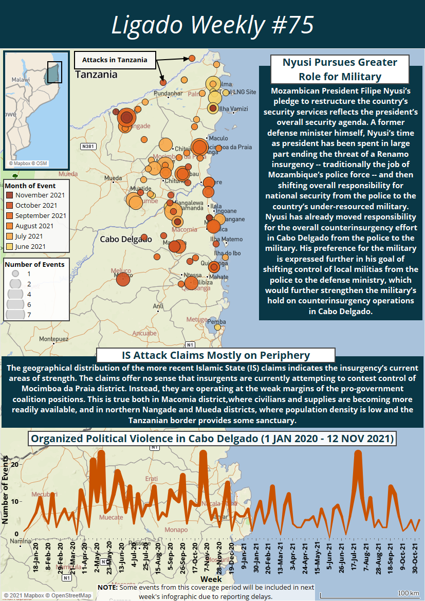 The week opened with an insurgent attack on Lijungo, about five kilometers south of Nangade town in Nangade district, on 8 November. No details of the attack are available, although witnesses reported that both Mozambican and SAMIM forces mobilized to pursue the attackers.