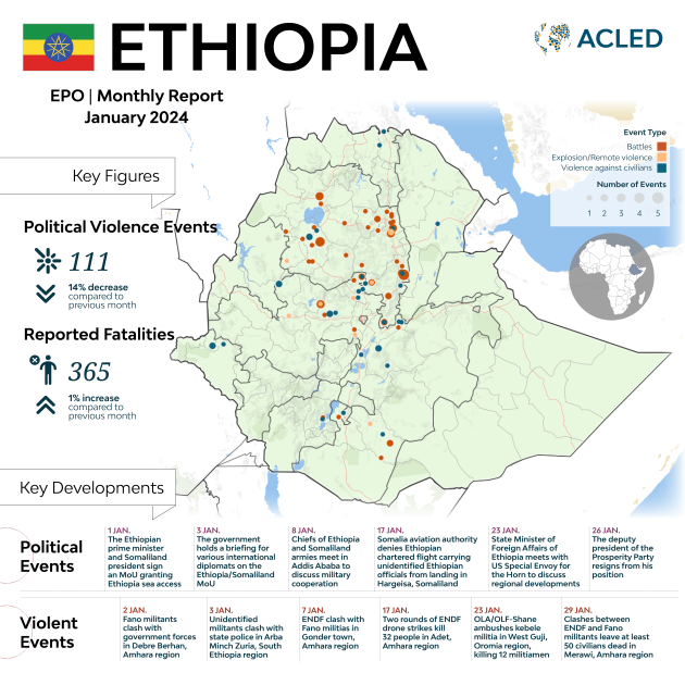 - In January, ACLED records 111 political violence events and 365 reported fatalities in Ethiopia.