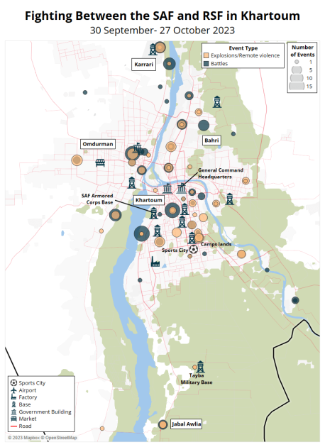 From 30 September to 27 October, ACLED records 129 battle events in Khartoum. Fighting broke out in several urban areas, including Jabal Awlia locality, the Armored Corps base, the General Command Headquarters (HQ), Camps lands, and Sports City (see map below). In particular, Jabal Awlia was the subject of heavy shelling by the RSF. It is a strategic location near the southern borders of Khartoum and White Nile state, home to the Air Force base, which the SAF took over in June. The White Nile River separates the RSF-controlled west side of Khartoum, and the east side, where the SAF Air Force base is located.